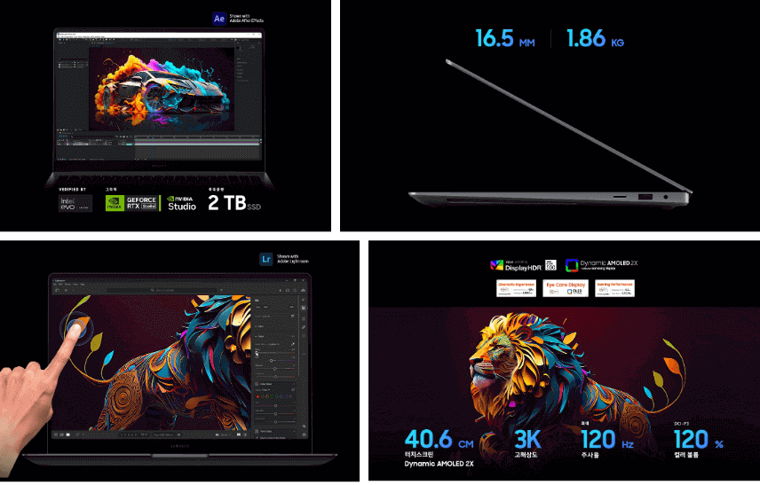 Dynamic AMOLED 2X 디스플레이로 실제와 가까운 색감을 경험할 수 있다고 합니다. 3K 수준의 고해상도와 120Hz의 주사율 지원으로 섬세하고 선명한 화면, 끊김 걱정 없이 부드러운 액션을 체험할 수 있습니다. 컬러 볼륨 120%의 풍부한 색감과 깊은 명암비는 그래픽 작업은 물론 영화, OTT 등 콘텐츠의 몰입감을 더욱 높여줍니다.