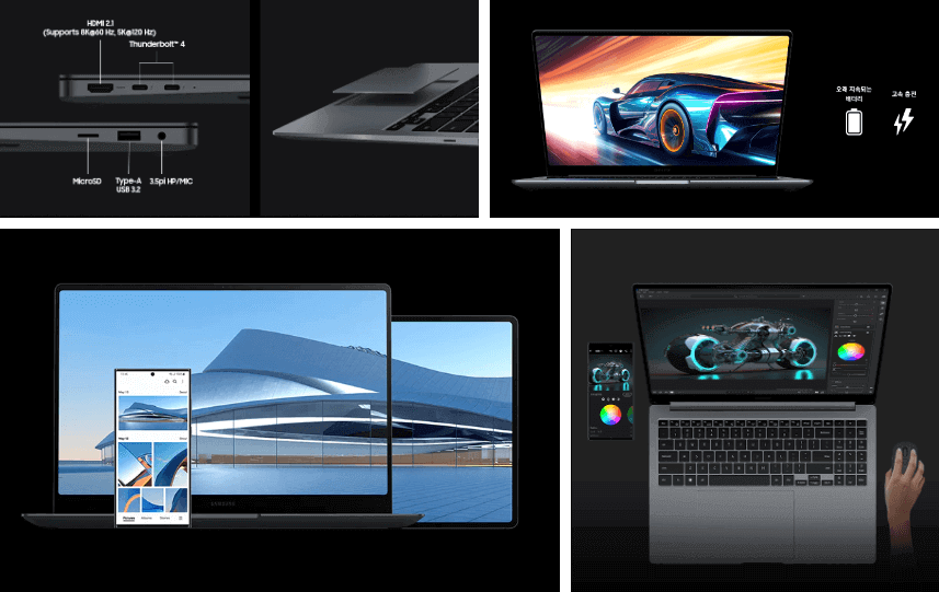 갤럭시 북4 울트라의 특장점은 16가지 정도 요약할 수 있습니다. 기존 갤럭시 북 3보다 가볍고 슬림하며 배터리 방전 없이 초고속으로 충전할 수 있다는 장점도 가지고 있습니다. 특히, 갤럭시 기기간 연결 작업이 가능하게 해주는 갤럭시 에코 시스템과 스마트폰에서 못다 한 영상 편집울 PC로 이어서 가능하다는 점이 인상적입니다. 갤럭시 북4 울트라로 언제 어디서나 과제, 작업, 음악 및 영화감상, 유튜브 시청 등을 해보시기 바랍니다.