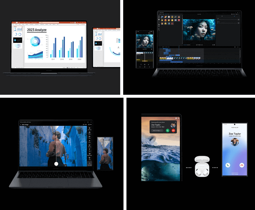 스마트폰으로 촬영한 영상을 간단히 편집하고, 퀵 쉐어를 활용해 작업 파일 그대로 공유해 갤럭시 북4 울트라에서 완성하는 일련의 과정을 할 수 있습니다. 갤럭시 기기끼리 넘나들며 끊김 걱정 없는 영상 편집을 경험해 볼 수 있습니다.