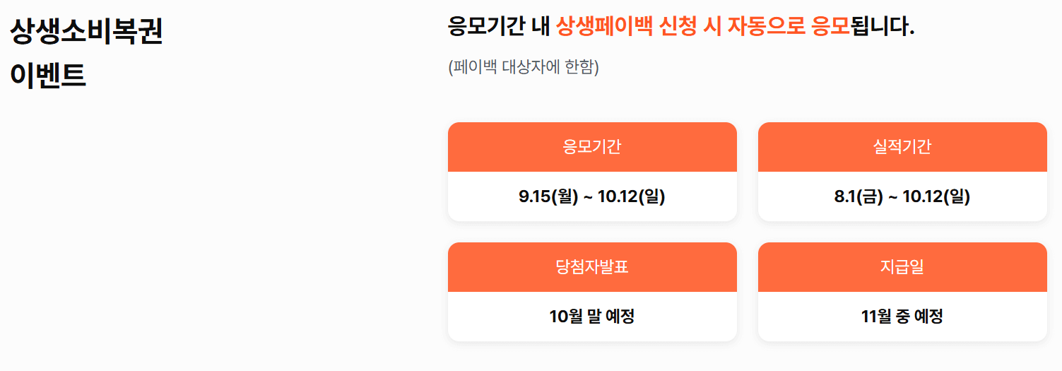 상생페이백 신청자라면 자동으로 상생소비복권 이벤트에 응모됩니다. 실적 기간 동안 누적 5만 원 사용 시 복권 1장을 제공받으며, 최대 10장까지 응모 가능합니다.