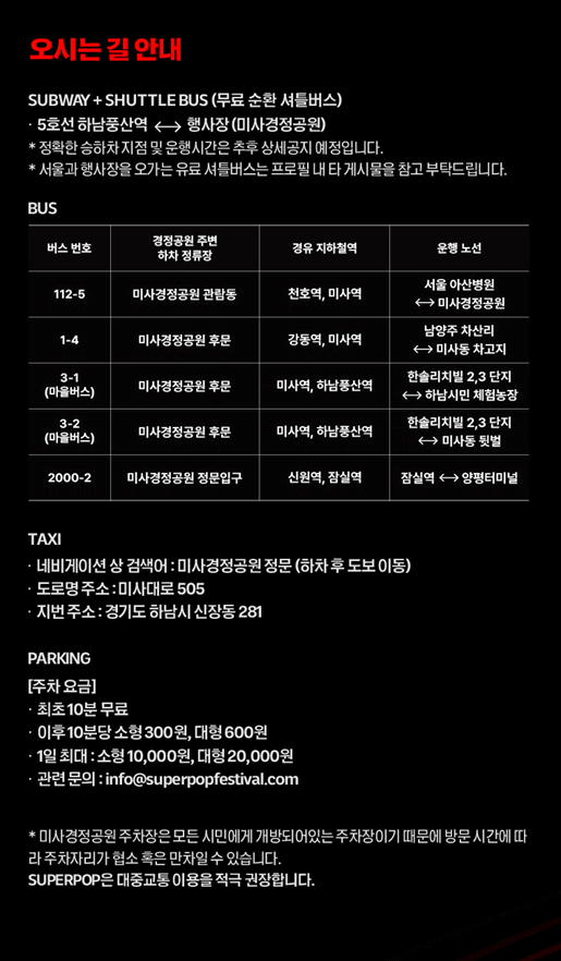 미사경정공원의 모든 주차장은 시민들에게 개방되어 있기 때문에 방문 시간에 따라 주차자리가 협소하거나 만차로 인해 주차가 불가능할 수도 있습니다. 슈퍼팝에서는 관람객 여러분들께서 가급적 대중교통 이용을 적극 권장합니다.