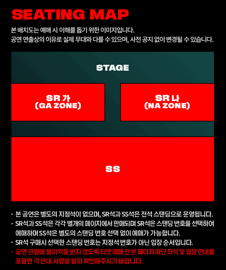 SR석 가구역(GA ZONE)과 SR 나 구역(NA ZONE)이 무대 바로 앞에 좌, 우로 배치 되어있고, SS석은 SR석 뒤에 자리하게 됩니다. 별도의 지정석이 없고, SR석과 SS석은 모든 자리가 스탠딩으로 운영됩니다. 슈퍼팝뮤직페스티벌의 배치도는 아래와 같습니다.