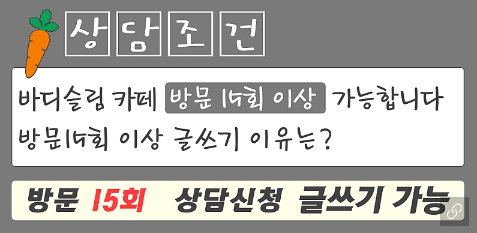 바디슬림 홈다이어트는 일반 과정과 비키니플러스 과정의 2가지 과정으로 나뉘어 있습니다. 한 달에 한번 후기를 올릴 때 얼굴을 비공개로 하면 일반 과정, 얼굴을 공개하면 비키니플러스 과정이고 일반 과정의 회비가 조금 더 비싸다고 합니다. 상담조건은 바디슬림 홈다이어트 카페( https://cafe.naver.com/bodyslimfitness )에 10회 이상 방문하시면 글쓰기가 가능하고, 좀 더 빠르게 상담하시고자 하는 분들은 얼굴 사진과 사연을 빠른 상담게시판을 통해서 올려주시면 방문 10회 없이도 상담이 가능하다고 합니다.