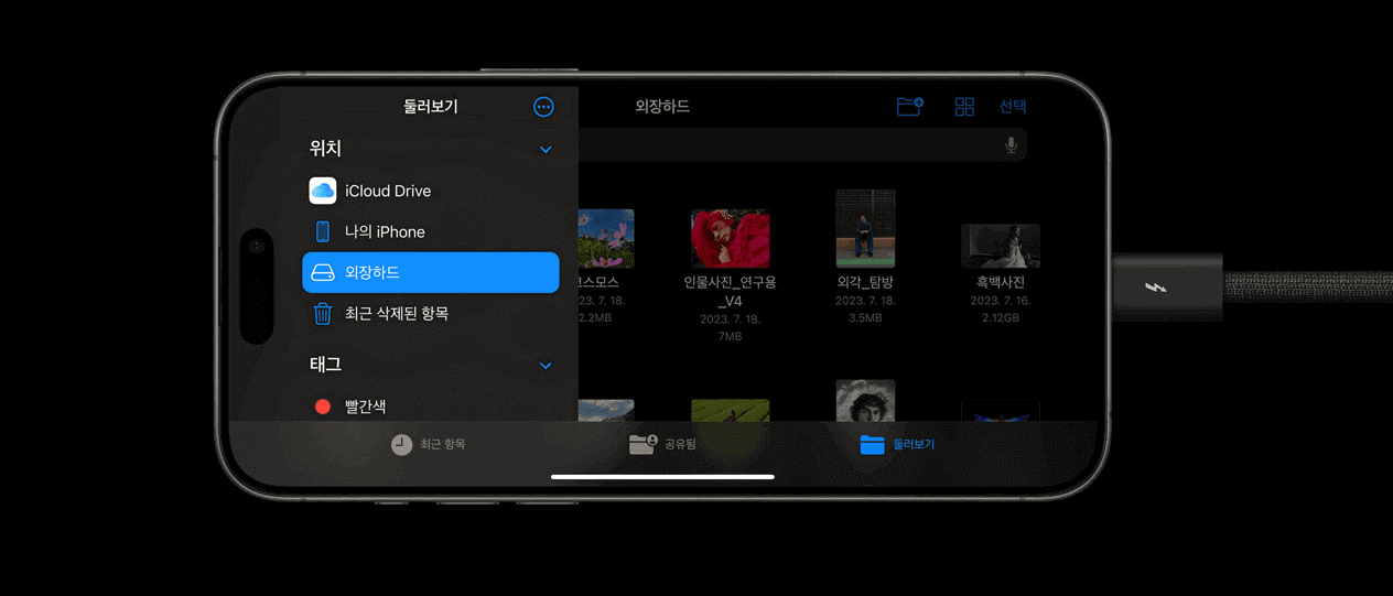 ▷ 아이폰 사상 최초로 USB 3를 지원하는 아이폰15 프로 5. 비약적으로 빨라진 속도로 데이터를 전송하고 그 어느 때보다 빠르게 프로급 워크플로를 처리할 수 있게 해 줍니다.