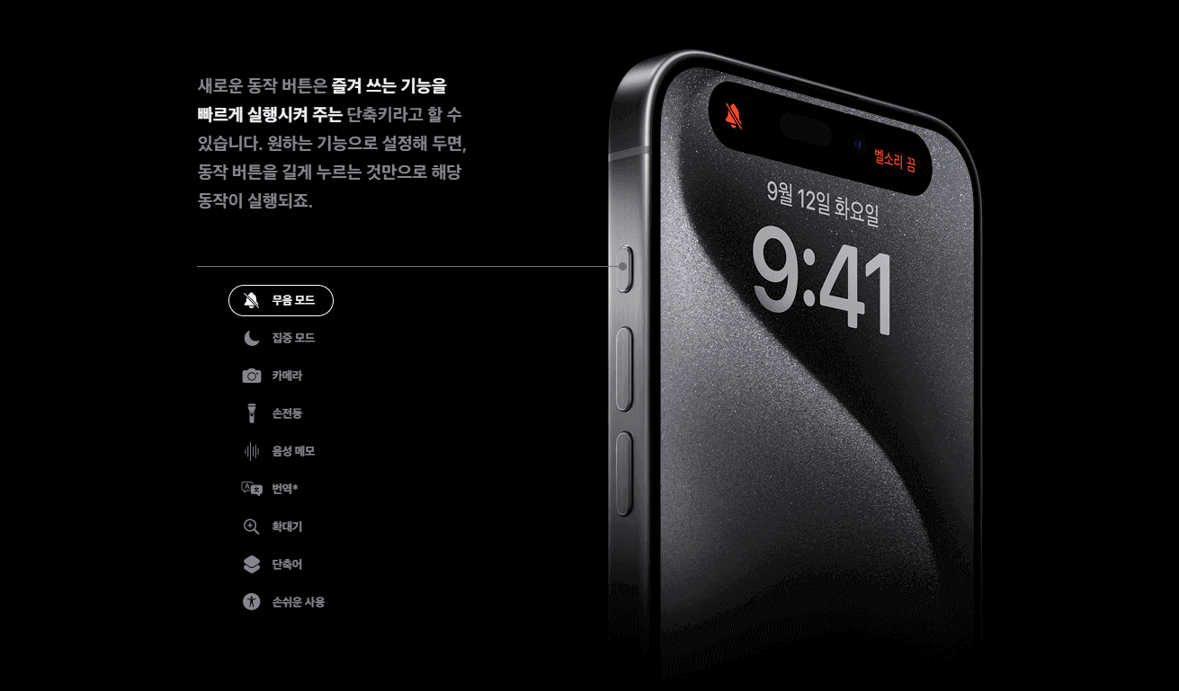 ● 초기 상태의 동작 버튼은 벨소리 모드와 무음모드를 오가는 기능을 하도록 설정되어 있습니다. 동작 버튼에 다른 동작을 할당한 경우에는 제어 센터를 이용해 기기를 음소거하거나 집중 모드 필터를 이용해 자동으로 무음 모드로 전환되도록 할 수 있습니다.