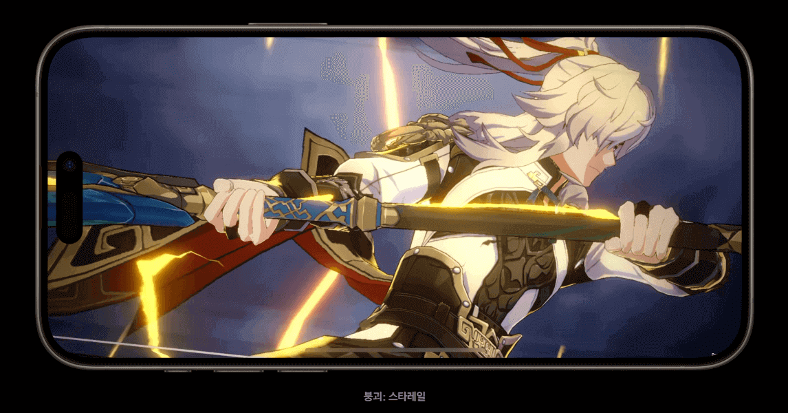 ● 역대 최고의 그래픽 성능을 갖춘 A17 Pro는 다른 어떤 아이폰 칩과도 비교할 수 없는 독보적인 칩입니다. 엄청나게 디테일한 배경과 살아 숨 쉬는 듯한 캐릭터로 모바일 게임을 즐길 때도 생생한 그래픽과 몰입감 넘치는 플레이 경험을 만끽할 수 있게 해 줍니다. 여기에 업계 최고 수준의 속도와 효율성까지 갖춘 A17 Pro, 무슨 일이든 쏜살같은 속도로 해치웁니다.