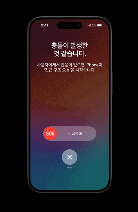 2. 아이폰은 심각한 자동차 충돌 사고 발생 시 이를 감지해 대신 구조 요청을 해줄 수 있습니다. 하드웨어 센서와 첨단 모션 알고리즘이 차체의 갑작스러운 속도 변화, 방향 전환 및 에어백 작동으로 인한 차내 기압 변화 같은 충돌 징후를 감지합니다. 그러면 아이폰이 대신 119에 전화를 걸어주고 저장해 둔 긴급 연락처로 알림을 보내줍니다. 정밀 이중 주파수 GPS 덕분에 위치 정보도 정확히 전달할 수 있습니다.