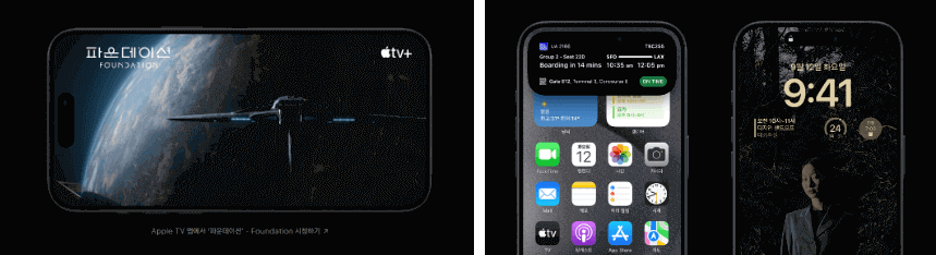 ● 요긴한 각종 알림과 실시간 현황 정보를 그때그때 띄워주는 다이내믹 아일랜드(Dynamic Island) 기능이 있습니다. 덕분에 다른 일을 하는 중에도 놓치지 않고 한눈에 쉽게 확인할 수 있습니다. 호출한 택시의 픽업 안내, 스포츠 경기 점수, 항공편 정보 등 다양한 정보를 꼭 필요한 순간에 바로 확인할 수 있답니다.