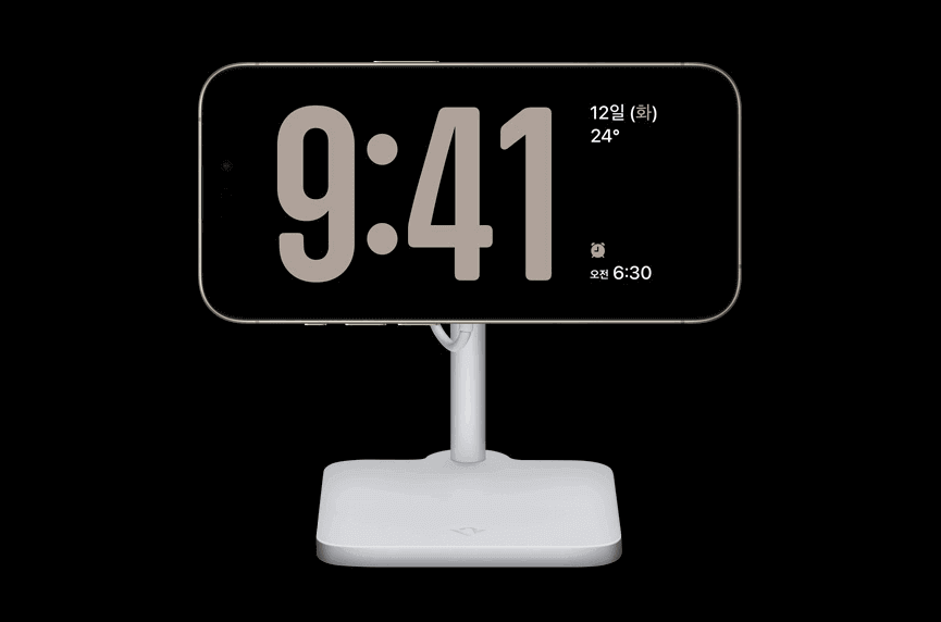 스탠바이아이폰(StandByiPhone)의 전체 화면을 색다른 방식으로 활용할 수 있게 해주는 스탠바이, 각종 유용한 정보를 멀찍이 서도 한눈에 볼 수 있게 띄워줍니다. 충전 중인 아이폰을 가로로 돌려서 시계처럼 사용할 수도 있고, 좋아하는 사진들이 담긴 전자 앨범처럼 활용하거나, 원하는 위젯을 계속 띄워놓을 수도 있답니다. 언제나 켜져 있는 상시표시형 디스플레이도 꿀잠을 방해하지 않도록 밤에는 밝기를 낮춥니다.