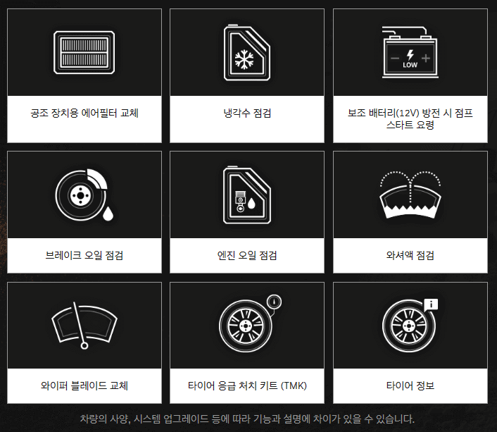 G80 자가정비 항목으로는 공조 장치용 에어필터, 냉각수 점검, 보조배터리(12V) 방전 시 점프 스타트 요령, 브레이크 오일 점검, 엔진오일 점검, 와셔액 점검, 와이퍼 블레이드 교체, 타이어 응급 처치 키트(TMK), 타이어 정보 등 수록되어 있습니다. 참고하셔서 안전 운행에 도움이 되시기 바랍니다.