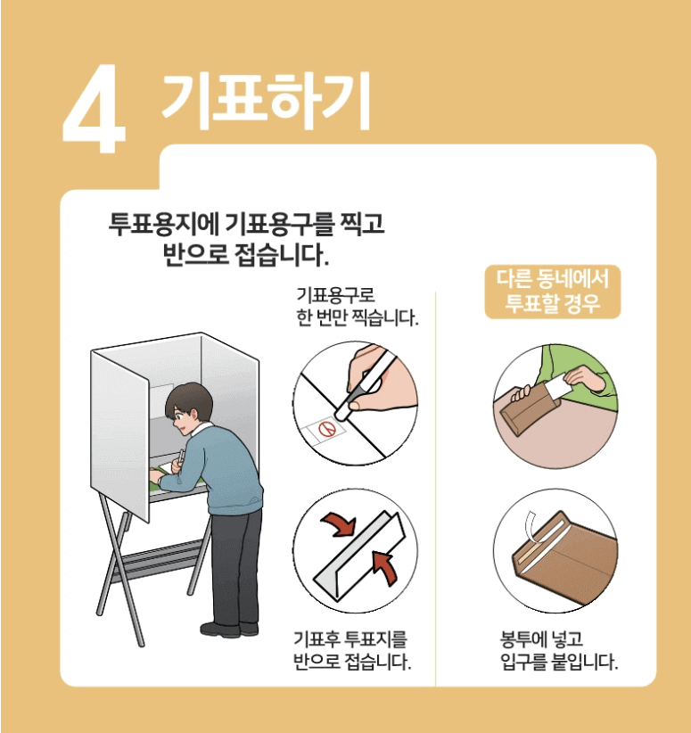 투표권을 가진 자가 본인이 거주하는 지역이 아닌 다른 지역에서 사전투표를 할 경우 지역구 국회의원 투표용지, 비례대표 국회의원 투표용지, 관외 사전투표 봉투를 신원 확인 후 받게 됩니다. 기표소 안에서 투표용지 두 장에 기표 용구로 찍은 후 관외 사전투표 봉투에 밀봉한 후 투표함에 넣으면 됩니다. 만약, 관외 사전투표 봉투를 밀봉하지 않은 채 투표함에 넣게 되면 무효 처리가 됩니다. 또 다른 주의사항으로는 기표소 안에서 촬영을 하는 행위, 투표용지를 촬영하는 행위, 투표를 하고 난 후에 몇 번 후보에게 투표했다고 다른 사람에게 말하는 행위 등은 큰 문제가 될 수 있기 때문에 각별히 유의하셔야 합니다.