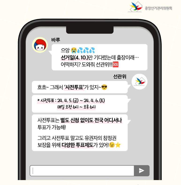 국회의원선거 투요일인 4월 10일 수요일에 투표를 하지 못하는 경우, 선거인이 별도의 신고 없이 사전투표기간(4월 5일 금요일 ~ 4월 6일 토요일, 오전 6시 ~ 오후 6시까지)에 읍·면·동마다 설치되어 있는 사전투표소에 가서 투표할 수 있는 편리한 제도를 말합니다.