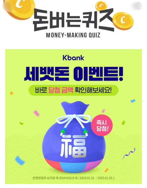 설 전에 케이뱅크에서 현금을 받을 수 있는 복주머니 이벤트를 진행한다고 합니다. 신규 고객은 물론 기존 고객님도 이벤트에 응모하실 수 있다고 하니 많이 참여하시면 좋을 것 같습니다.