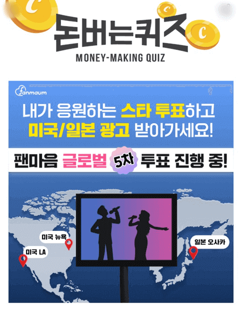 내가 응원하는 스타에게 투표하면 미국, 일본에 광고를 할 수 있다고 합니다. 팬마음 글로벌 5차 투표가 진행 중이니 내가 좋아하는 스타에게 해외광고라는 선물을 주는 것도 좋을 듯 합니다.