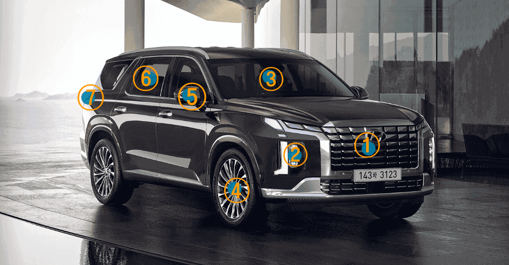 카 라이프중 손상되기 쉬운 프론트, 리어 범프등 7부위에 우레탄 계열의 투명한 보호 필름을 부착하여 스톤칩으로 인한 페인트 손상 및 생활 스크래치를 예방하여 깨끗한 바디를 유지하는데 도움을 줍니다. 적용부위는 프론트 범퍼 사이드, 도어컵, 도어 엣지, 도어 스텝, 주유구 도어, 리어 범퍼 사이드, 사이드 미러 등이고, 리어 휠 아치 부위에는 캘리그래피 트림 및 잉크 트림 차량만 차량 보호 필름이 적용됩니다.