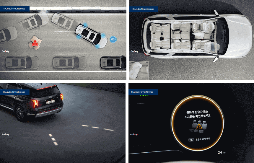 차량 뒷문의 개폐 여부와 차량 내 센서를 통해 후석 승객 유무를 판단합니다. 시동을 끄고 운전석 도어를 열면 클러스터 메시지, 경고음을 통해 운전자가 후석을 확인하게 합니다.