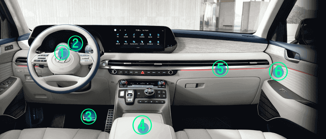 1/2열 도어 가니쉬 하단과, 1열 콘솔 사이드 부에 은은한 조명을 적용하여 고급감을 전달합니다. AVN 설정 화면에서 고객이 직접 64가지 색상 및 전문가 추천 10가지 색상을 선택할 수 있습니다.