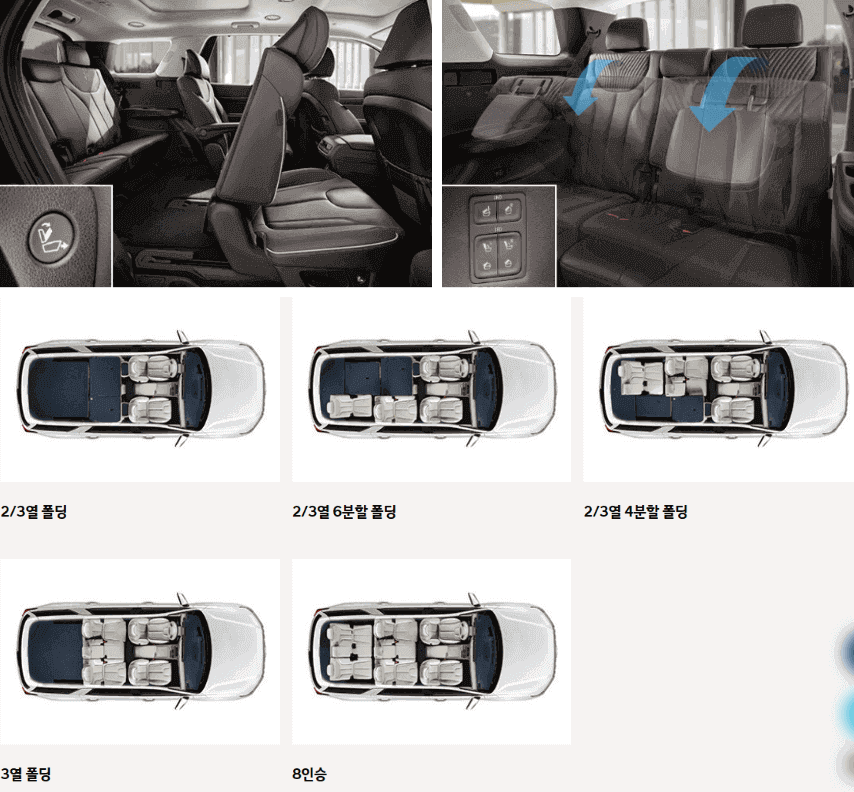 러기지 공간에 있는 버튼을 눌러 3열 시트를 편리하게 접고 펼 수 있습니다.