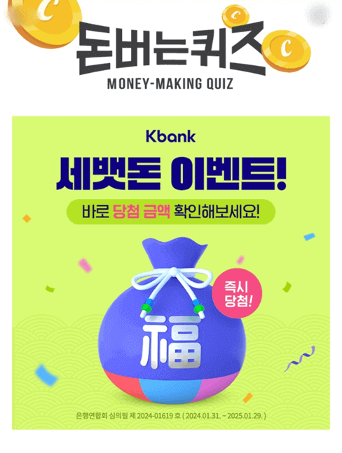 3. 케이뱅크에서 설날을 맞이하여 매일 현금으로 OOO을 받을 수 있는 이벤트를 준비했는데요, OOO에 들어갈 단어는 무엇일까요? (초성힌트 : ㅅㅂㄷ)