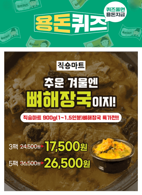 직숑마트에서 900g(1~1.5인분) 뼈해장국 특가전을 진행한다고 합니다. 관심있으신 분들은 많은 참여바랍니다.