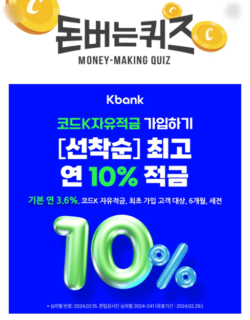 1. 케이뱅크가 처음이라면 코드K 자유적금 가입 시 최고 연 10%(기본 연 3.6%, 6개월, 세전)까지 우대받을 수 있는 금리우대OO를 받을 수 있는데요, OO에 들어갈 단어는 무엇일까요? (초성힌트 : ㅋㄷ)