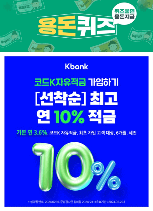 1. 케이뱅크가 OO인 신규 고객이면 최고 연 10%(기본 연 3.6%, 6개월, 세전) 코드K 자유적금을 가입할 수 있는 금리우대코드를 받을 수 있는데요, OO에 들어갈 단어는 무엇일까요? (초성 힌트 : ㅊㅇ)