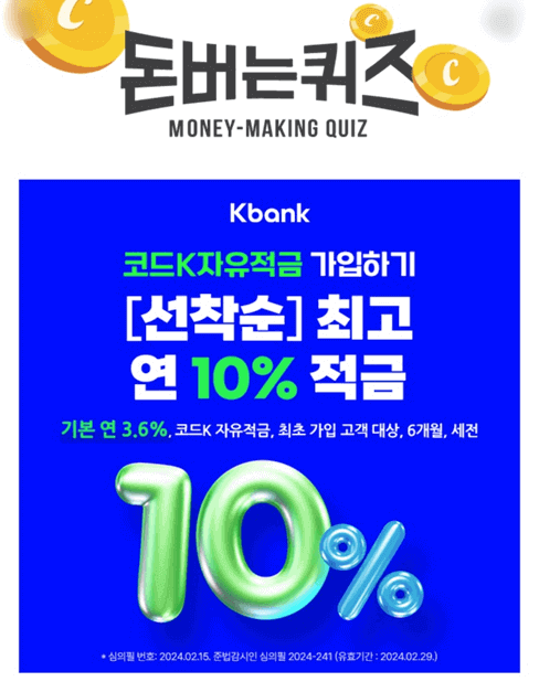 1. 케이뱅크가 처음이라면 코드K 자유적금 가입 시 최고 연 10%(기본 연 3.6%, 6개월, 세전)까지 우대받을 수 있는 금리우대OO를 받을 수 있는데요, OO에 들어갈 단어는 무엇일까요? (초성힌트 : ㅋㄷ)