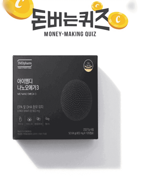 1. 아이엠디나노오메가3는 EPA와 DHA의 합이 900mg 으로 4가지 기능성(기억력 개선, 건조한 눈 개선, 혈중 중성지질 개선, OO개선)이다. (힌트 : ㅎㅎ)