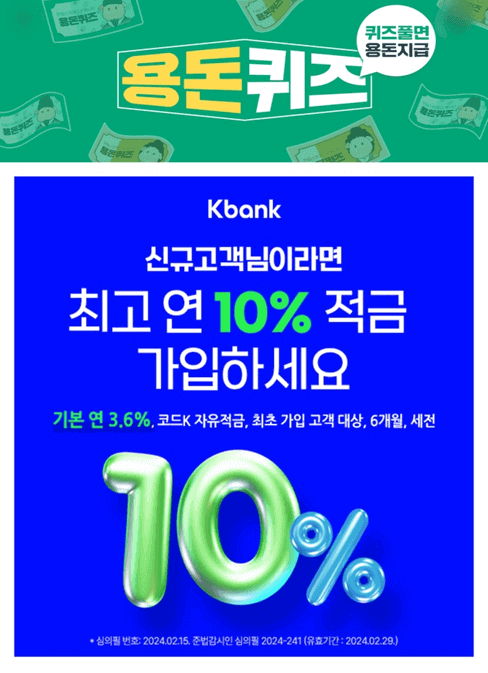 1. 케이뱅크가 처음이라면 코드K 자유적금 가입 시 최고 연 10%(기본 연 3.6%, 6개월, 세전)까지 우대받을 수 있는 금리우대OO를 받을 수 있는데요, OO에 들어갈 단어는 무엇일까요? (초성힌트 : ㅋㄷ)