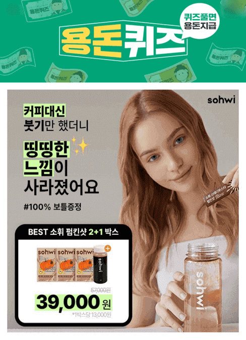 "매일 먹는 물만 이 호박차로 바꿔보세요" 수천건의 V라인 간증템 소휘 펌킨샷! 짜게 먹은 날 커피대신 가뿐한 아침을 경험하세요. 2+1 한정특가