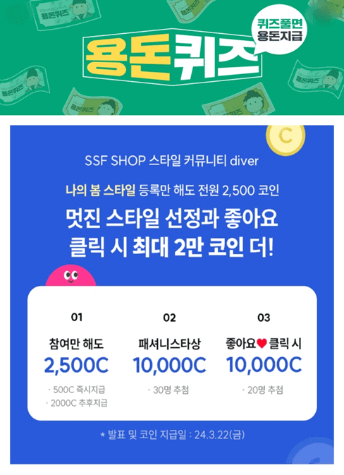 1. 삼성물산 패션몰 SSF샵 스타일 커뮤니티 diver에 #OOOOOO 해시태그와 함께 나의 봄 스타일을 공유해주세요! 멋진 스타일 선정과 좋아요 클릭 시 최대 20,000 코인 더 추첨 적립해드립니다!