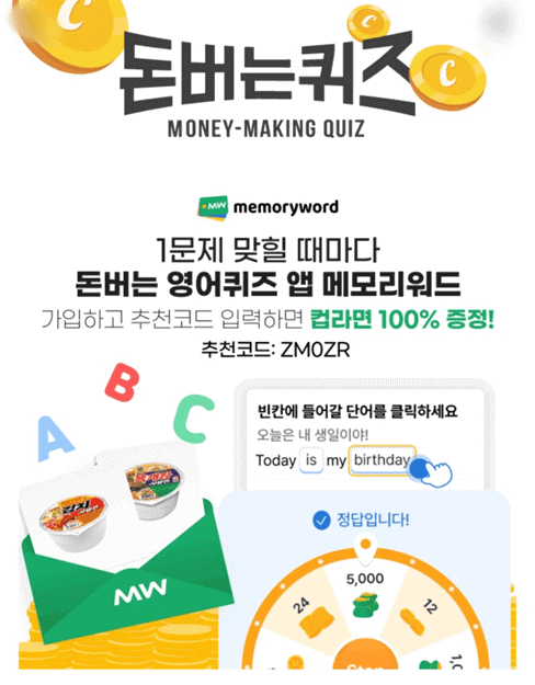 1문제 맞힐 때마다 돈버는 영어퀴즈 앱 메모리워드를 소개합니다. 가입하고 추천코드(ZMOZR)를 입력하면 컵라면을 100% 증정한다고 합니다.