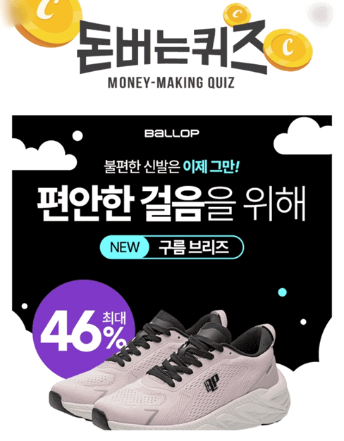 4. 구름처럼 폭신한 착화감을 선사하는 구름 브리즈는 OOOOO으로 최적의 쿠션감을 제공하여 발의 피로도를 낮추고 있습니다. 빈칸에 들어갈 글자는 무엇일까요? (힌트 : ㅋㄹㅇㄷㅍ)