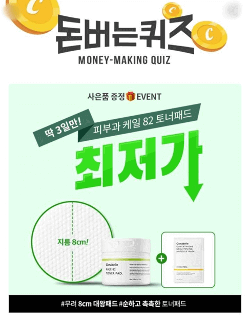 1. 제나벨이 대왕 케일토너패드 1+1 행사와 글루타치온 마스크팩 사은품 증정까지 합니다. 한 개를 1만 원대에 가져갈 수 있는 기회 놓치지 마세요! 토너패드에는 각질제거와 수분진정에 도움이 되는 케일잎추출물이 OOO,OOOppm 함유되었습니다. (힌트 : 숫자)