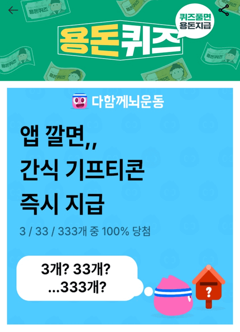 1. 두뇌게임으로 놀면서 돈버는, 다함께뇌운동은 OO 적립형 뇌운동 앱이다. (힌트 : ㅅㄷ)