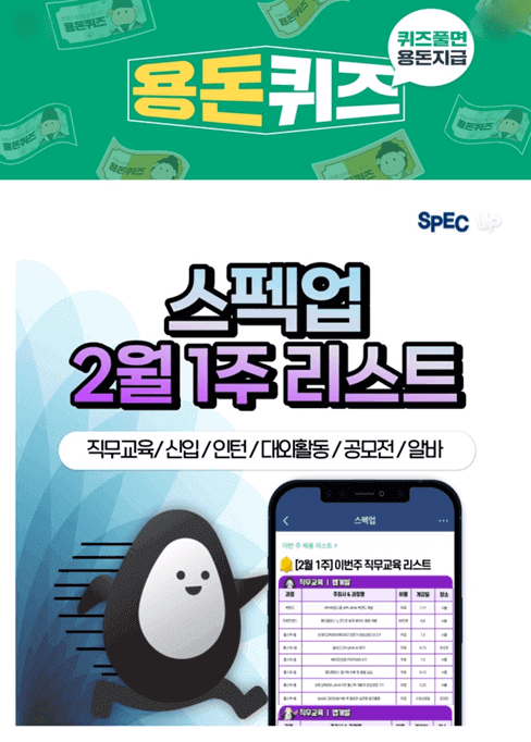2월 1주 스펙업 리스트에 대해서 안내해 드리겠습니다. 10만 취준생이 확인한 스펙업 주간 리스트를 확인하셔서 취업 준비하시는데 조금이나마 도움이 되시기 바랍니다.