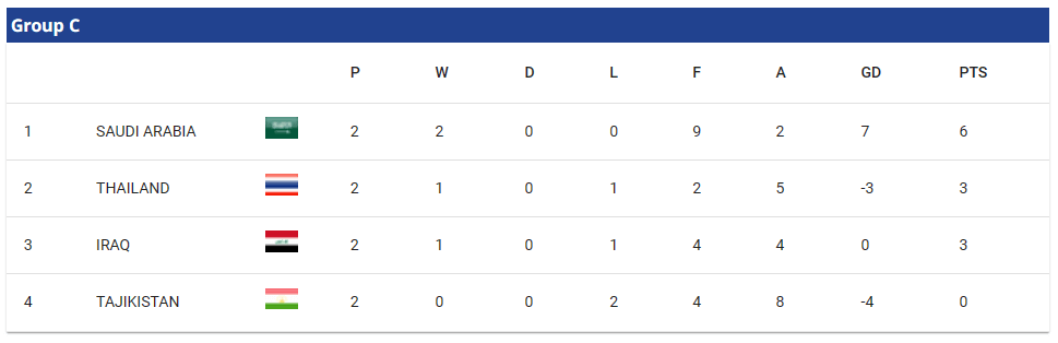 사우디아라비아, 이라크, 태국, 타지키스탄이 속한 조별리그 C조 경기결과입니다. 국가별로 조별리그는 세 경기씩 치르게 되며, 경기 후 결과는 바로 업데이트하도록 하겠습니다.