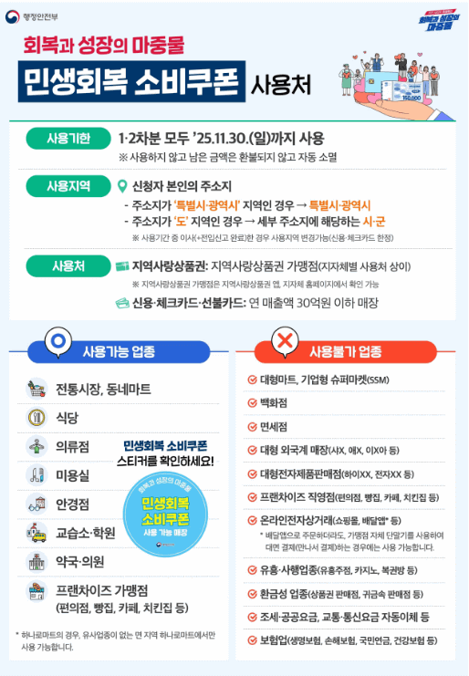 1차·2차 모두 2025년 11월 30일(일)까지 사용해야 하며, 이후 미사용 금액은 자동 소멸됩니다.