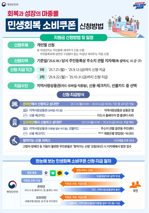 정부는 2025년 7월 21일부터 민생회복 소비쿠폰을 본격적으로 지급합니다. 본 정책은 침체된 지역경제를 살리고 국민의 소비를 촉진하기 위한 지원금 제도로, 전 국민을 대상으로 최대 55만 원의 혜택을 받을 수 있습니다. 이번 글에서는 소비쿠폰의 신청 방법, 대상, 금액, 지급 일정, 사용처까지 모든 정보를 한눈에 확인할 수 있도록 정리했습니다.