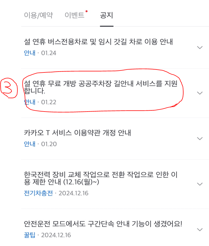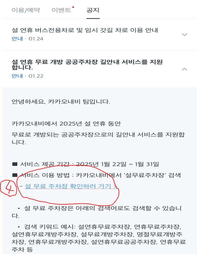 3. 공지란에 ③설연휴 무료 개방 공공주차장 서비스란을 클릭합니다.
