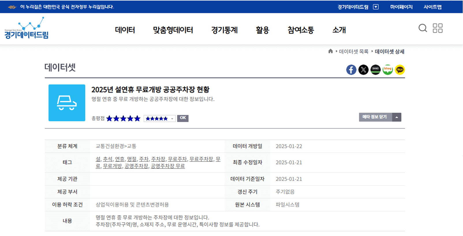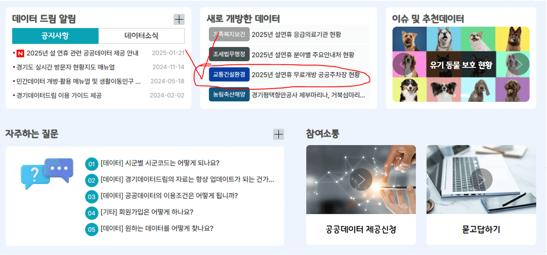 2. 메인화면에서 스크롤을 내려보면 "새로 개방한 데이터"이라는 항목에서 [교통건설환경] 2025년 설연휴 무료개방 공공주차장 현황을 클릭합니다.