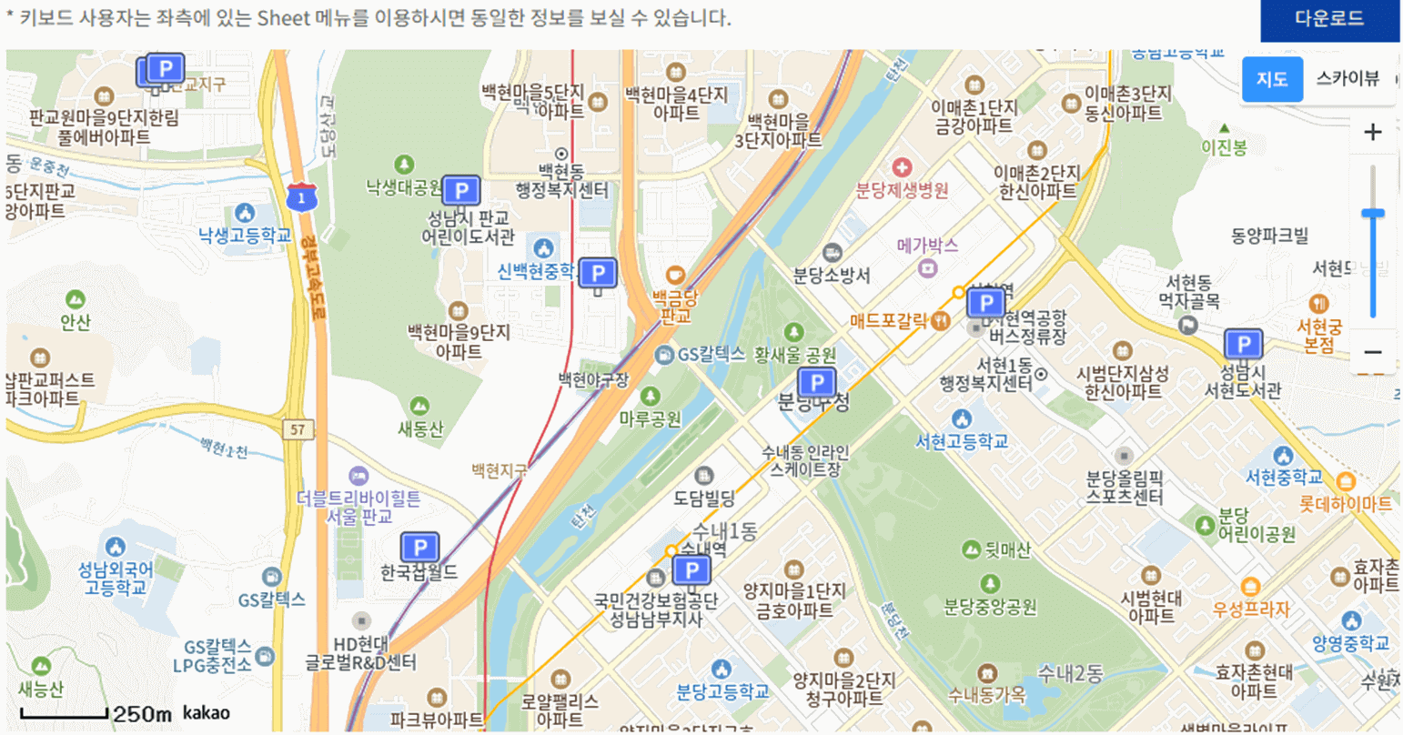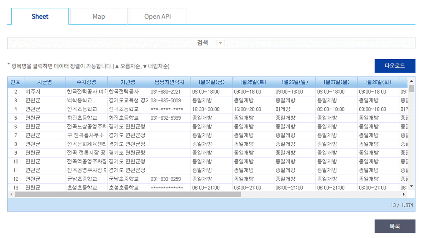 4. 바로 밑에 Sheet, Map, Open API라는 3가지 항목이 보입니다. Sheet를 클릭하면 시군명, 주차장명, 기관명, 담당자연락처, 개방 요일 및 개방 시간 등을 확인할 수 있고, Map을 클릭하시면 지도로 주차장 위치를 확인하실 수 있습니다.
