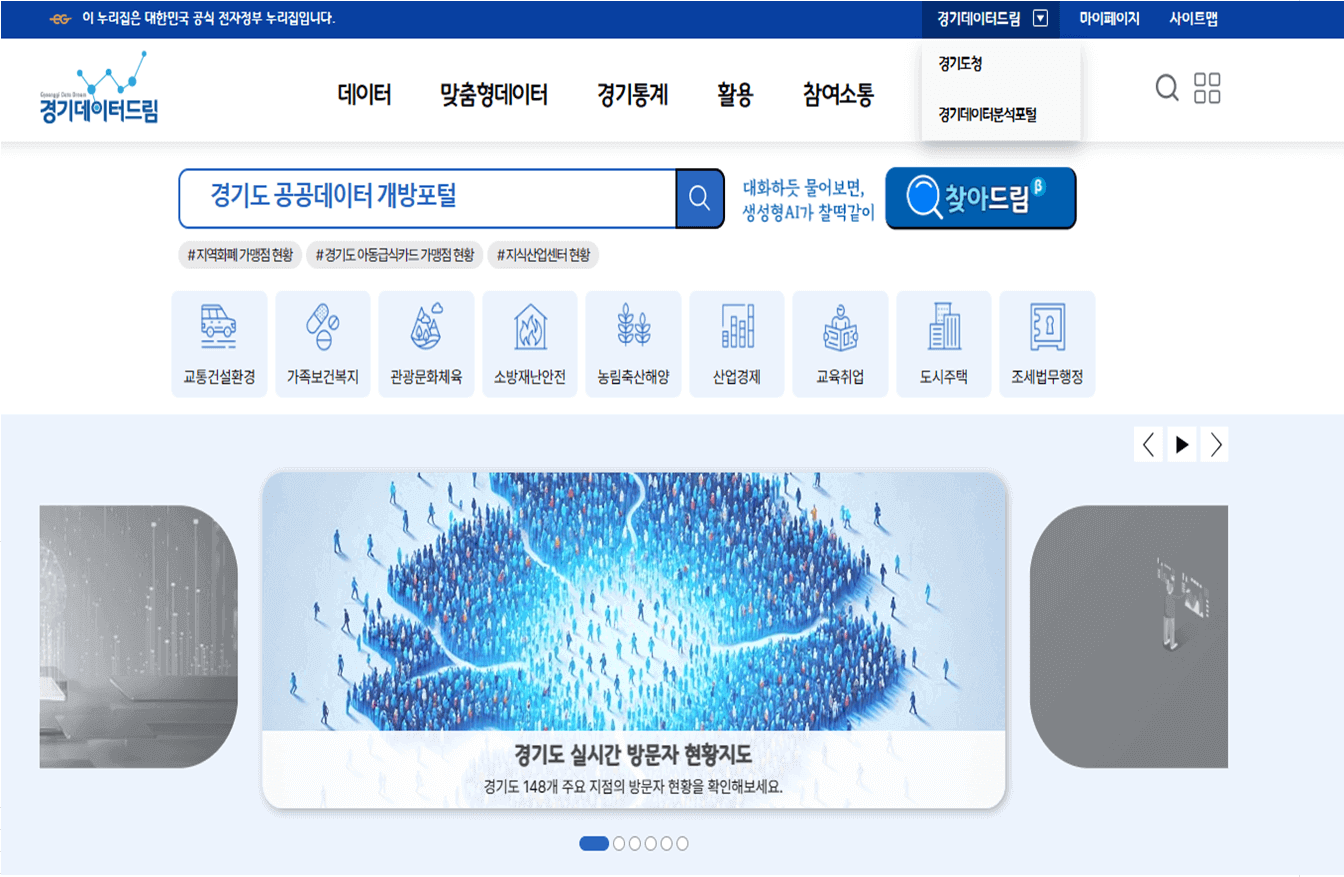 1. 인터넷에서 경기데이터드림( http://data.gg.go.kr )을 클릭하면 다음과 같은 메인 화면이 나옵니다.