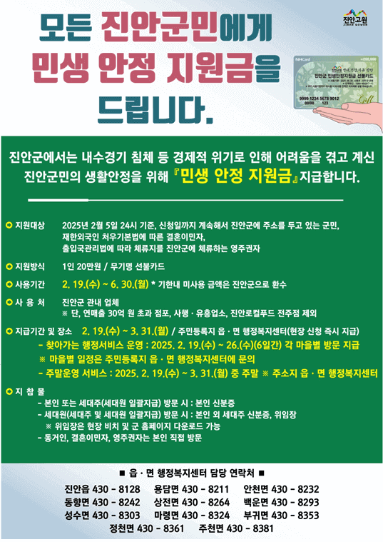 📢 진안군에서는 모든 진안군민에게 1인당 20만원의 민생안정지원금을 지급합니다!