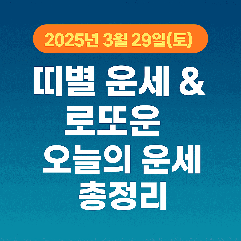 2025년 3월 29일 토요일, 오늘의 띠별 운세와 로또운세를 확인해보세요. 재물운, 연애운, 건강운, 사업운까지 띠별로 정리된 운세 정보와 로또번호 선택에 도움 되는 길일 정보를 총정리했습니다.
