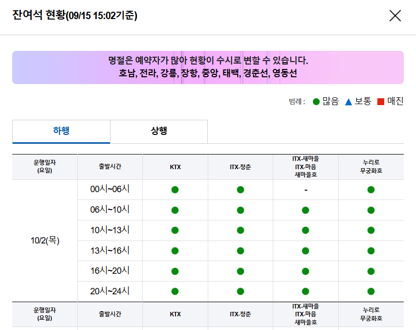 - 명절 기간에는 자유석·유아동반석·노인석·KTX 동반석 등이 운영되지 않을 수 있습니다.