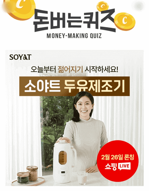 1. 불리지 않은 생콩과 물만 넣고 20분 만에 무첨가 건강두유를 만들어주는 주방 가전 이름은?