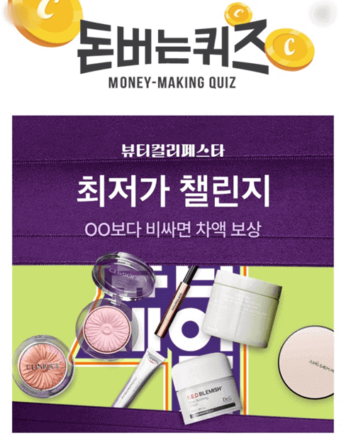 1. 지금 뷰타컬리페스타에선 70여 개 브랜드, 100여 개 상품을 가장 좋은 가격으로 만날 수 있는 최저가챌린지 진행 중! 하루 두 번 무조건 OOO 쿠폰 받고, 더욱 강력해진 뷰티 혜택을 누려보세요!