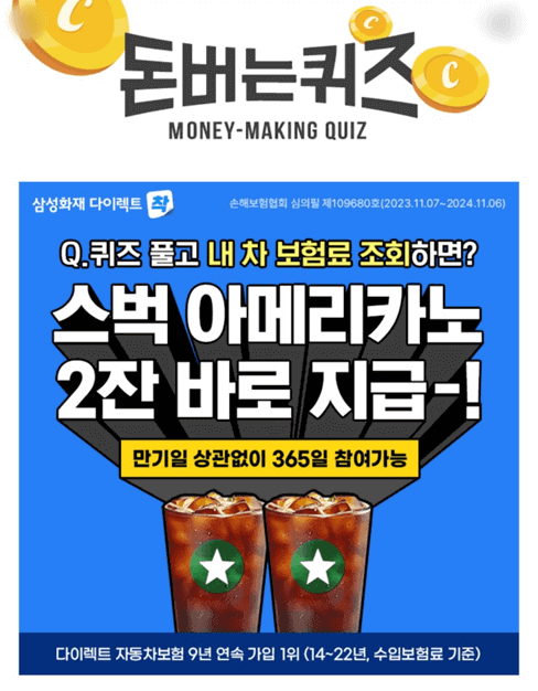 삼성화재 다이렉트에서 퀴즈풀고 내 차 보험료를 조회하면 스타벅스 아메리카노 2잔을 바로 지급하는 행사를 한다고 합니다. 만기일 상관없이 365일 참여 가능하다고 하니 관심있으신 분들은 많은 참여 바랍니다.