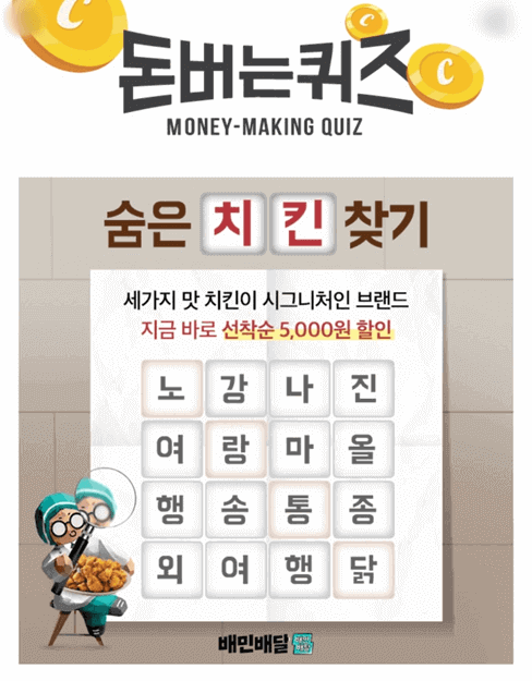 5. 배민이 직접 배달하는 OOOO 쿠폰으로 주문할 때마다 할인 받아요. 빈칸에 들어갈 단어는 무엇일까요?